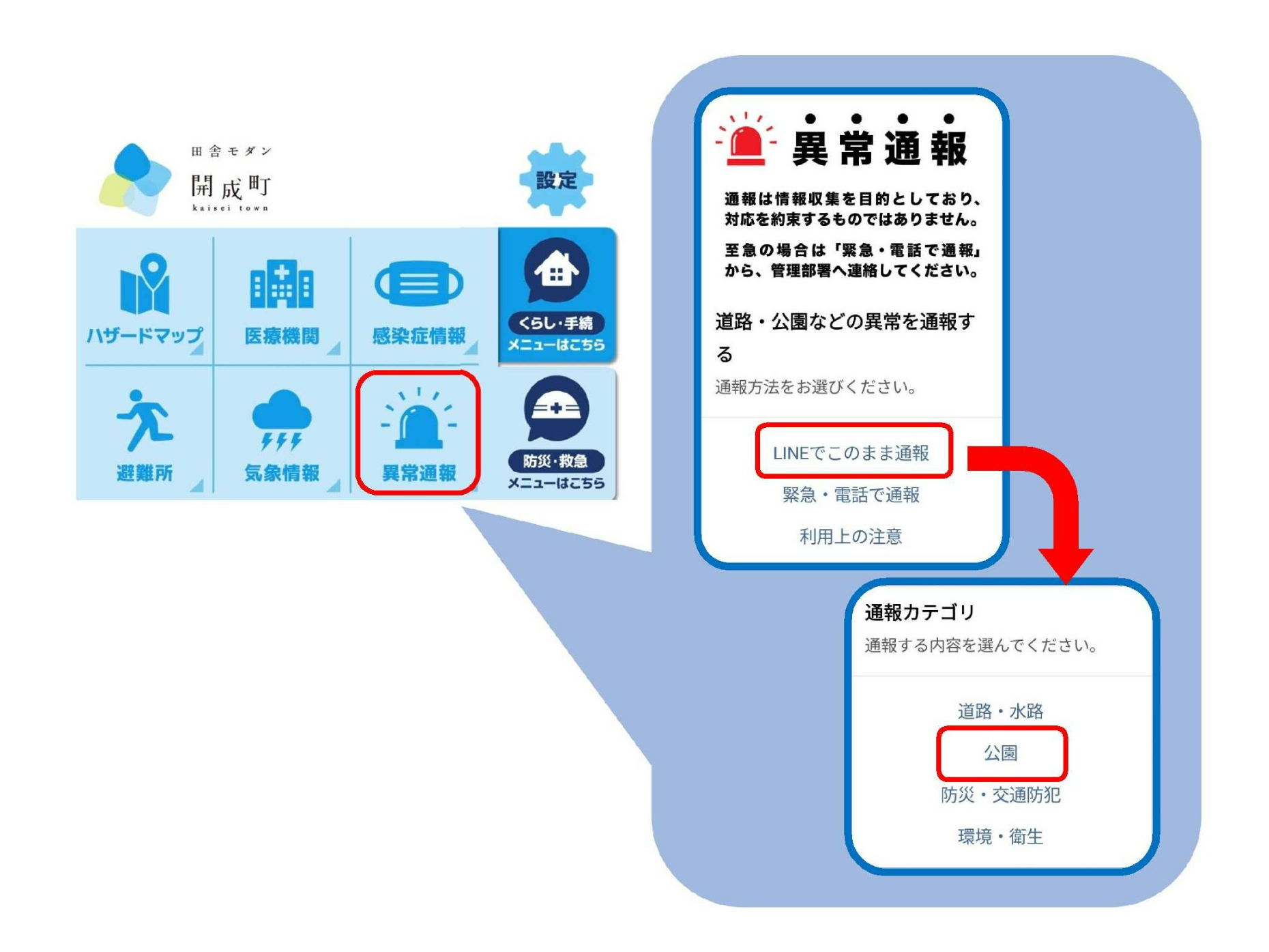 開成町では町内の道路や公園などにおいて、異常や損傷等を発見された際に、公式LINEアカウントより町役場担当課に通報いただけるシステムを導入しております。開成町の公式LINEアカウントの「異常通報」のメニューをタップし、通報カテゴリ「公園」を選択いただき、通報内容をご記入の上、状況のわかる写真を送ってください。
